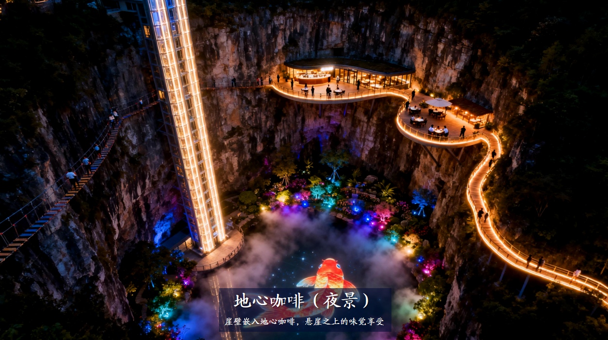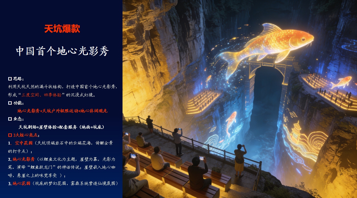 本项目位于贵州省,以天坑为支点,撬动鲤鱼坝景区发展。通过片区系统谋划,分区分点分期实施:让朝天洞天坑项目成为鲤鱼坝景区的核心吸引物 !让鲤鱼坝景区成为兴仁市旅游高质量发展的名片,成为民族地区乡村振兴的“两山”转化与共同富裕样板 !