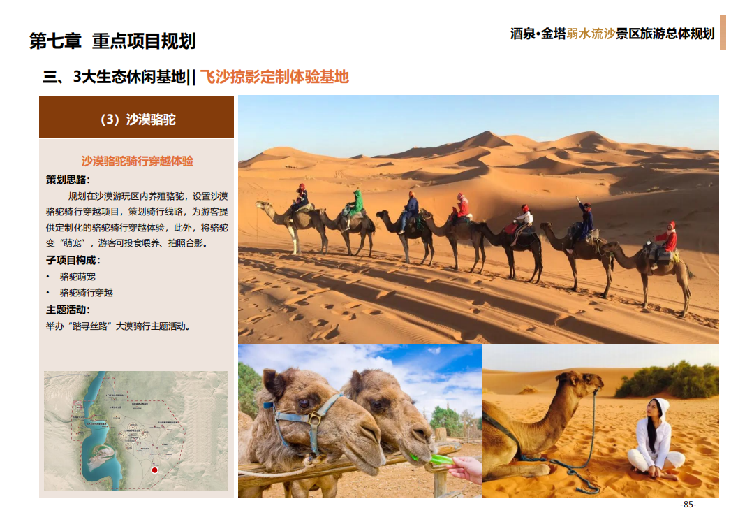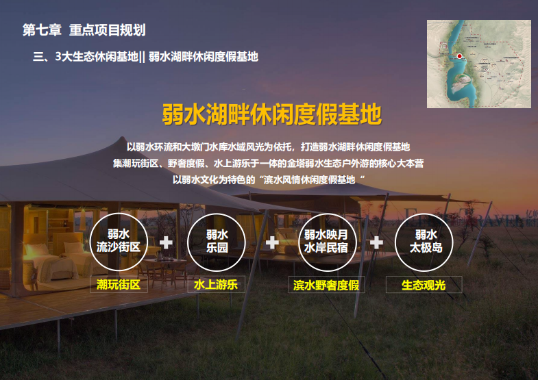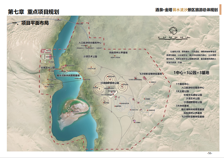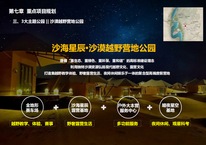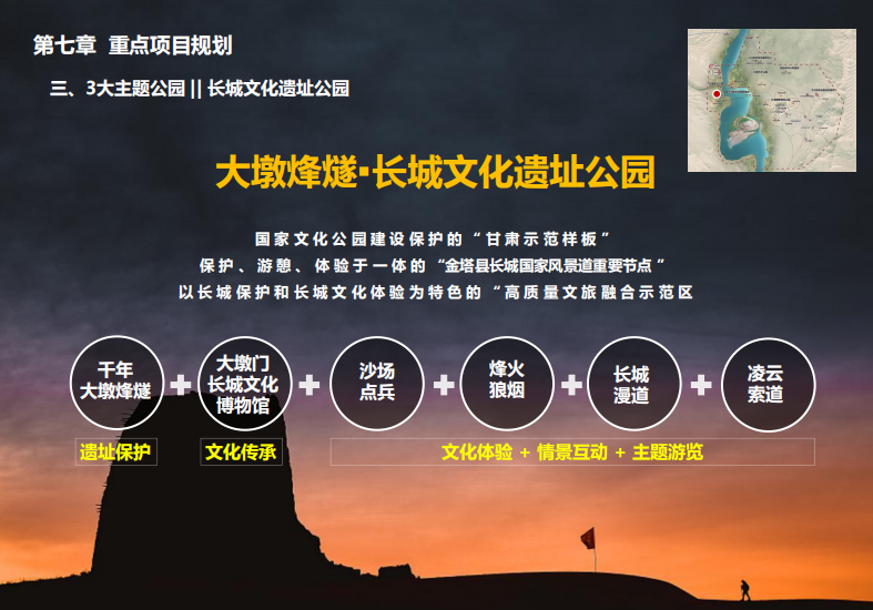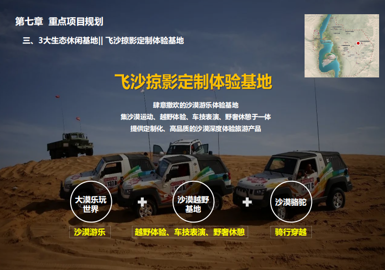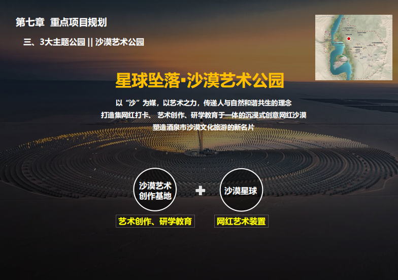 本项目以金色沙漠、碧色弱水、古色遗址、绿色梭梭林等生态资源为基础,以长城文化、弱水文化体验为核心,抢抓长城文化公园建设机遇,盘活基地优质的人文生态资源,将项目基地打造成集生态观光、沙地运动、文化体验、休闲度假等功能于一体的中国唯一、国际一流”的沉浸式沙漠潮玩旅游目的地。