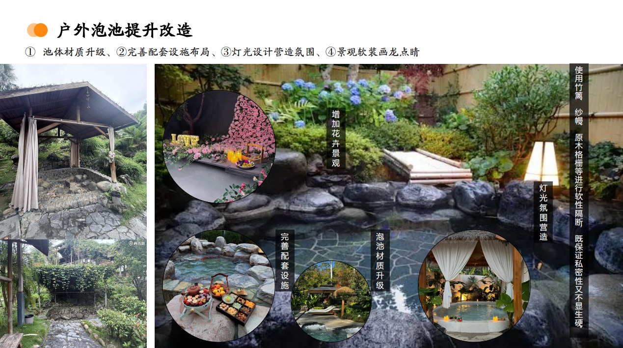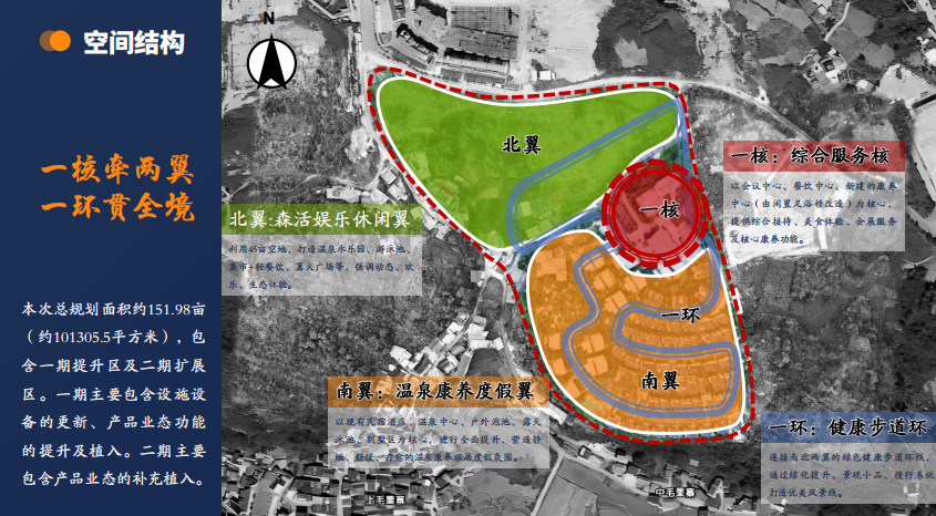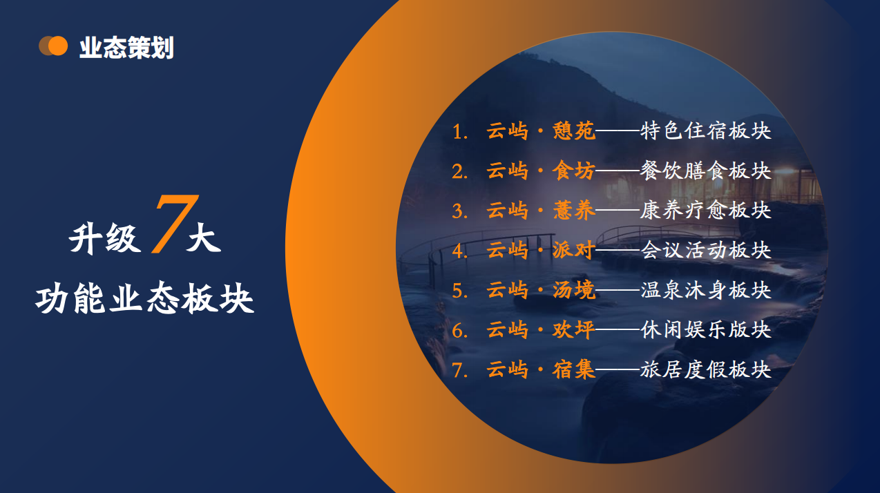 本项目以温泉暖资源为基底,气候凉资源为特色,布医、苗医药文化为灵魂,以"温泉康养"为核心,融合度假、休闲、养生社区等功能于一体,构建颜值、品质、特色、场景四维升级的沉浸式体验空间,打造四季可游、全龄可享的复合型康养旅居综合体。