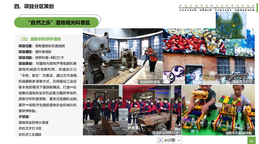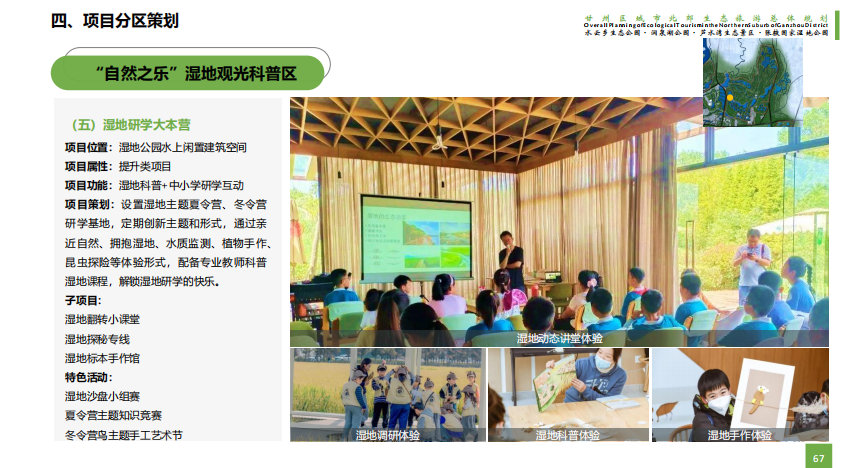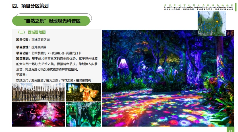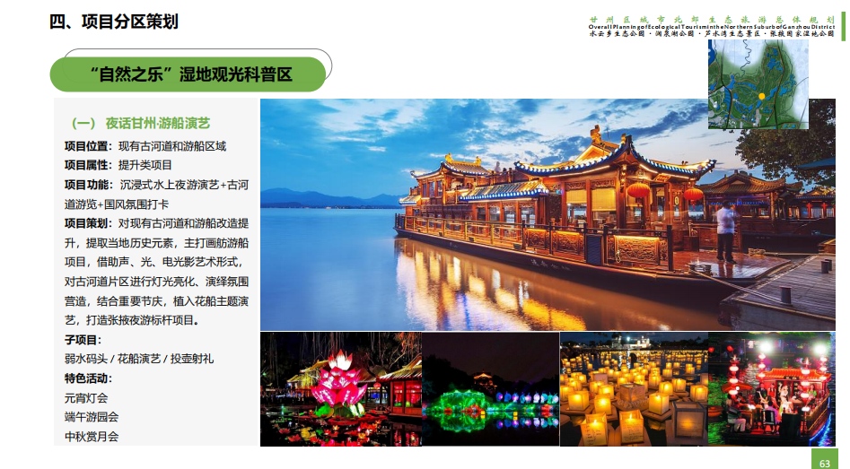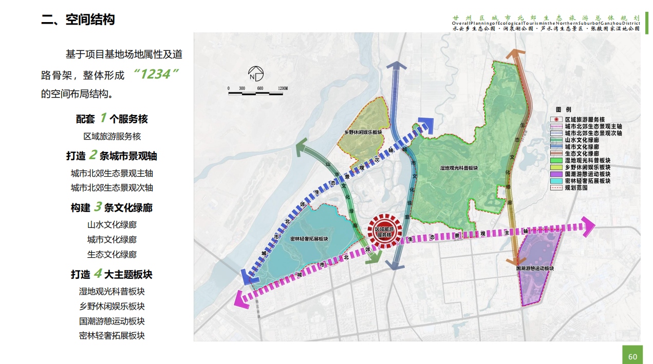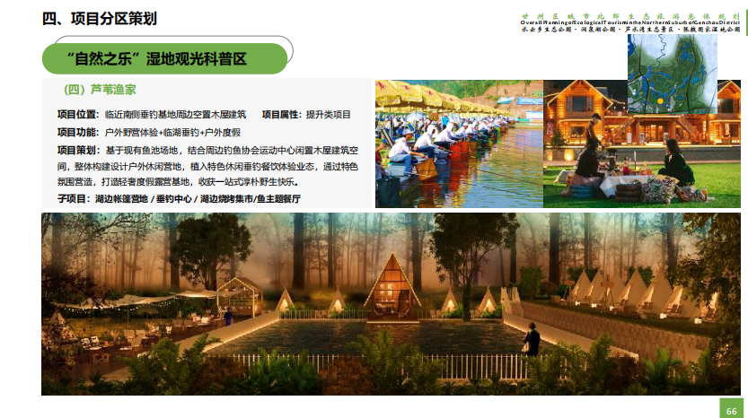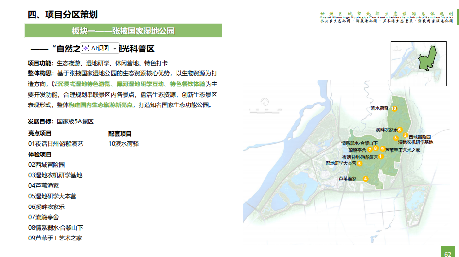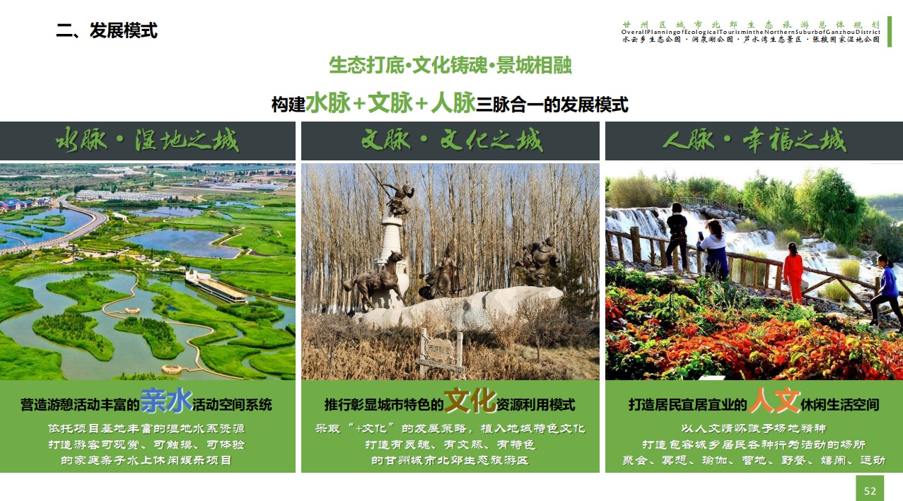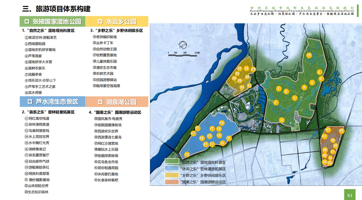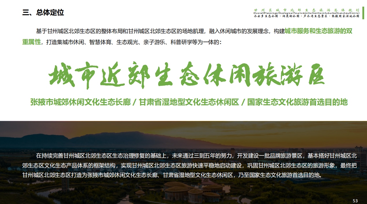 基于甘州城区北郊生态区的整体布局和甘州城区北郊生态区的场地肌理,融入休闲城市的发展理念,构建城市服务和生态旅游的双重属性,打造集城市休闲、智慧体育、生态观光、亲子游乐、科普研学等为一体的:城市近郊生态休闲旅游区。