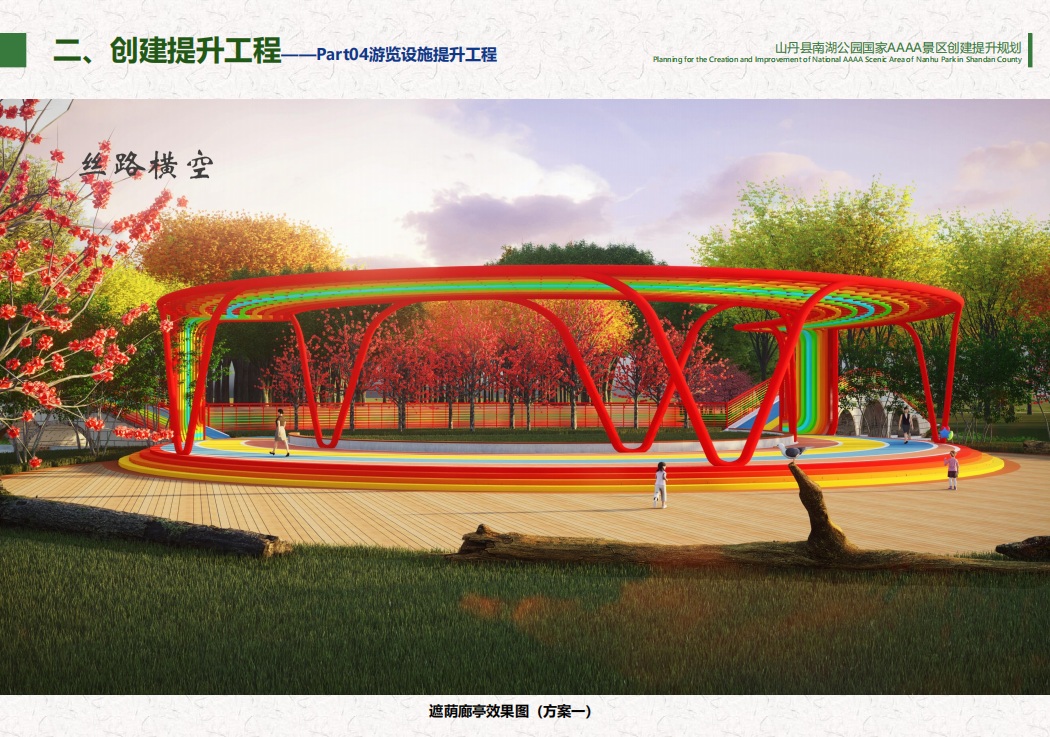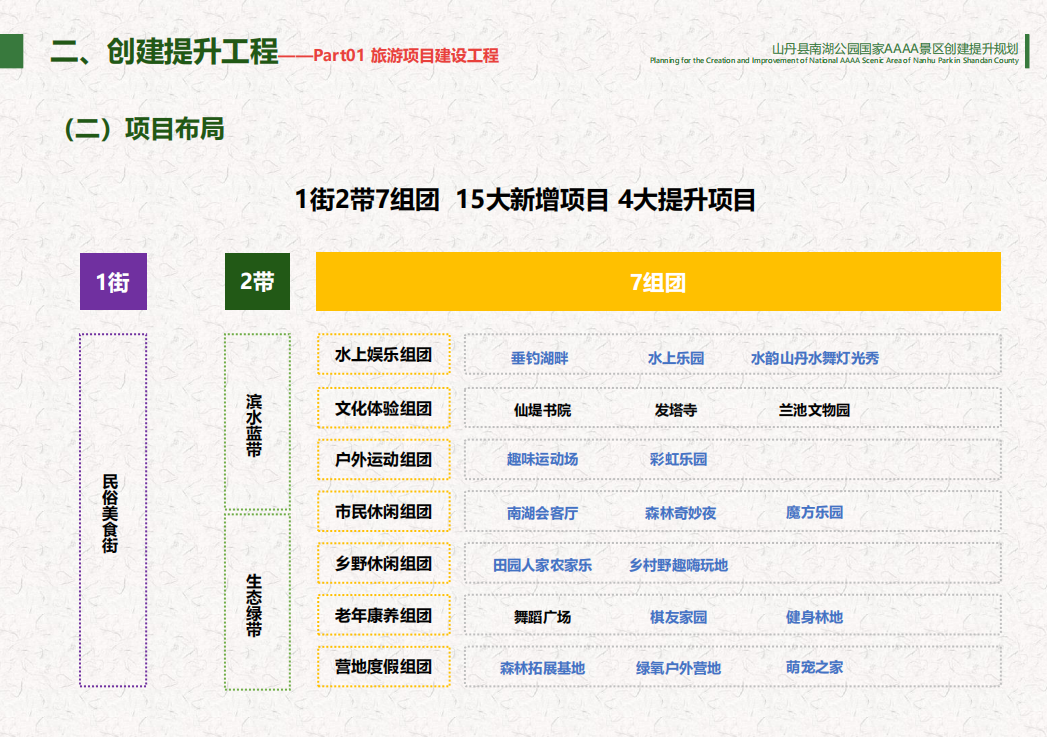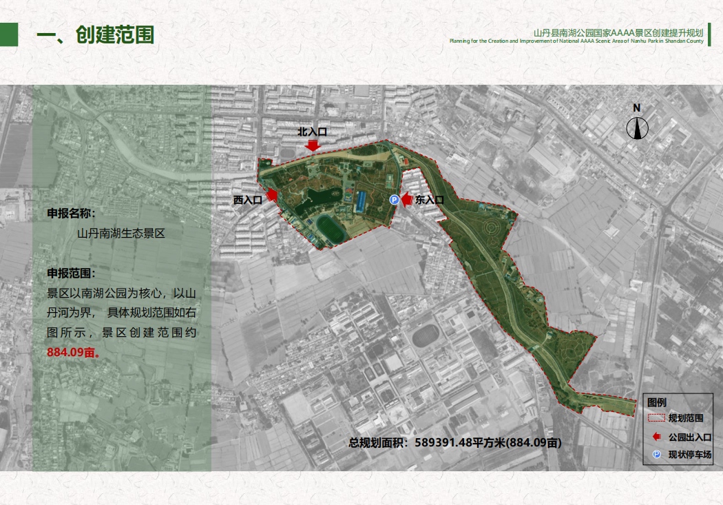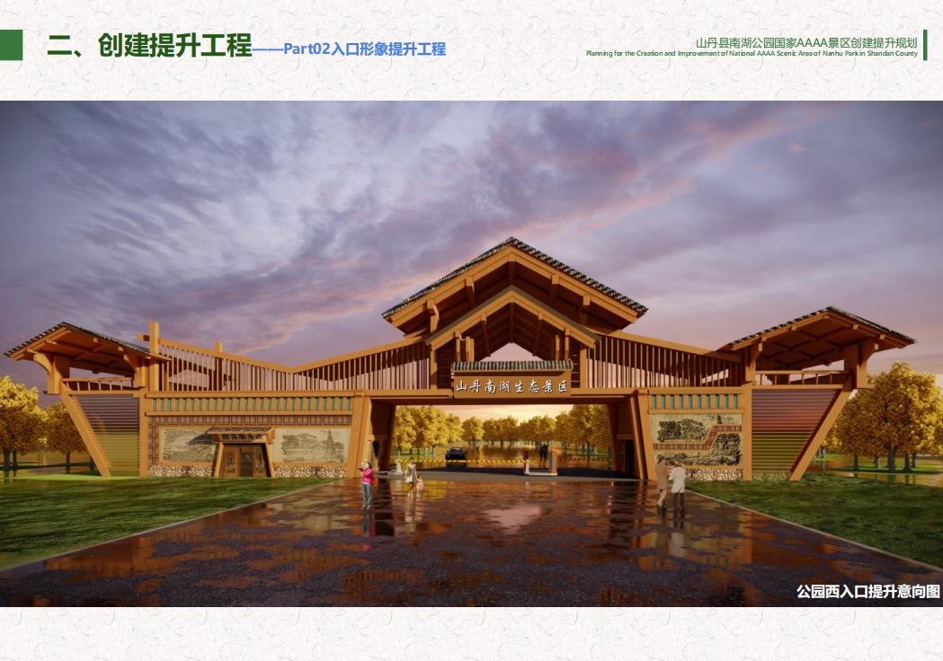 本项目以南湖生态环境为基底,以历史人文资源为底蕴,以将基地改造成为“城市综合性公园”及“国家AAAA级旅游景区”为宗旨,开展“景观提升、治理提升、业态提升”行动,强化筑景聚人、创新公园治理、打造多元业态,引入“周末经济”“夜间经济”,将南湖公园打造成集休闲、娱乐、运动、科普等城市公园的基础功能及纪念、经营、参与等人文互动功能于一体的:多功能综合性城市公园综合体。
