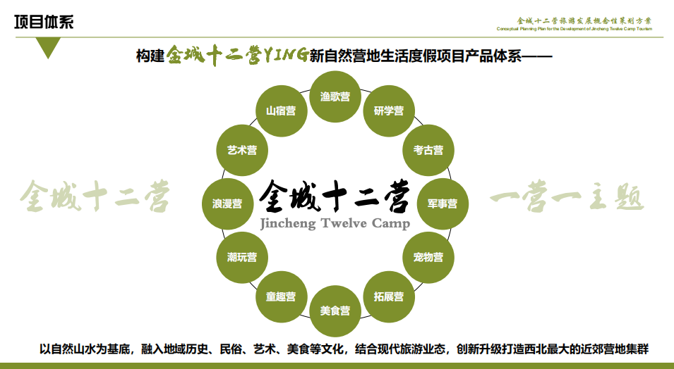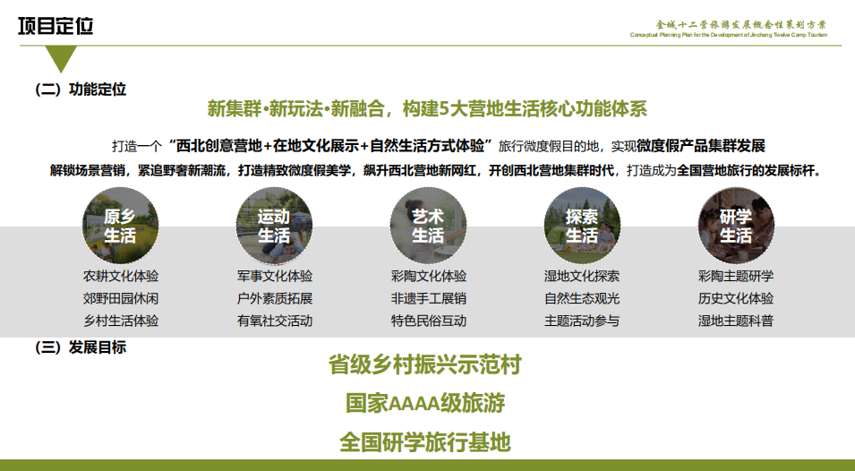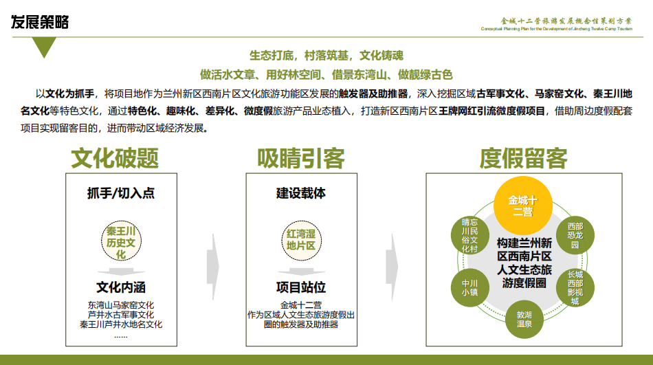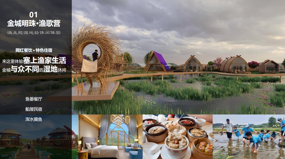在对当地自然资源、历史遗迹、文化内涵深度挖掘基础上,本项目将现代化微度假体验业态巧妙与基地核心文化元素深度融合,以湿地亲水度假为特色,力求为游客提供集户外休闲、生态观光、郊野微度假等需求为一体的个性化、特色化、体验式场景,以“湿地亲水度假+山水田园休闲+文化体验共享+郊野营地放松”的“四核驱动”的城市近郊新自然生活微度假旅行营地集群。孵化营地集群特色旅游IP,突出交通互联、线路串联、文化关联、历史通联,精心打造近郊“微度假”、城市“慢生活”、休闲“深体验”营地度假品牌,打造望得见青山、看得见绿水、记得住乡愁的:中国首个城市郊野一站式生态度假营地集群。