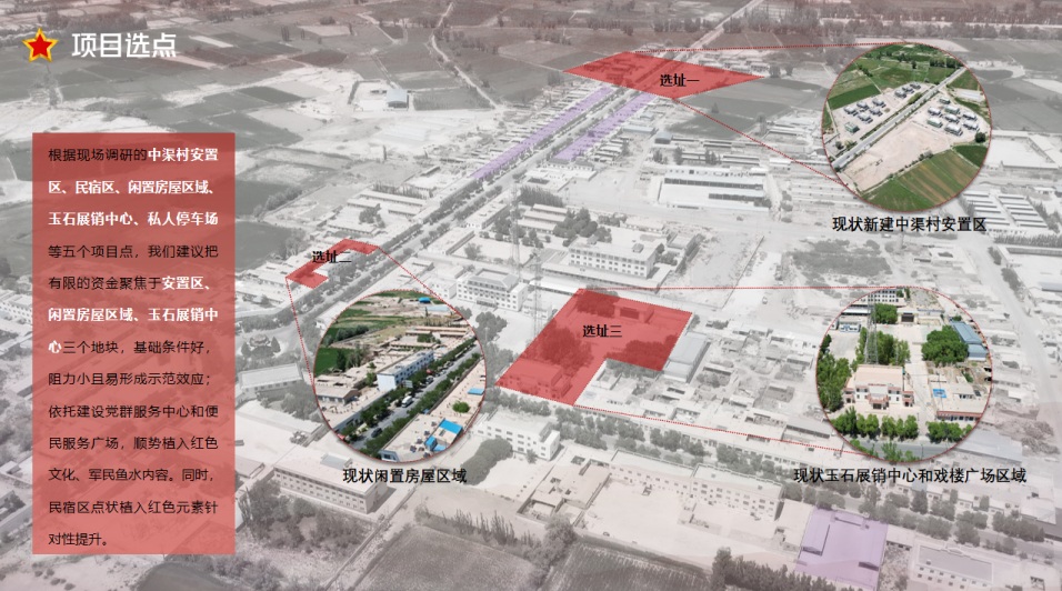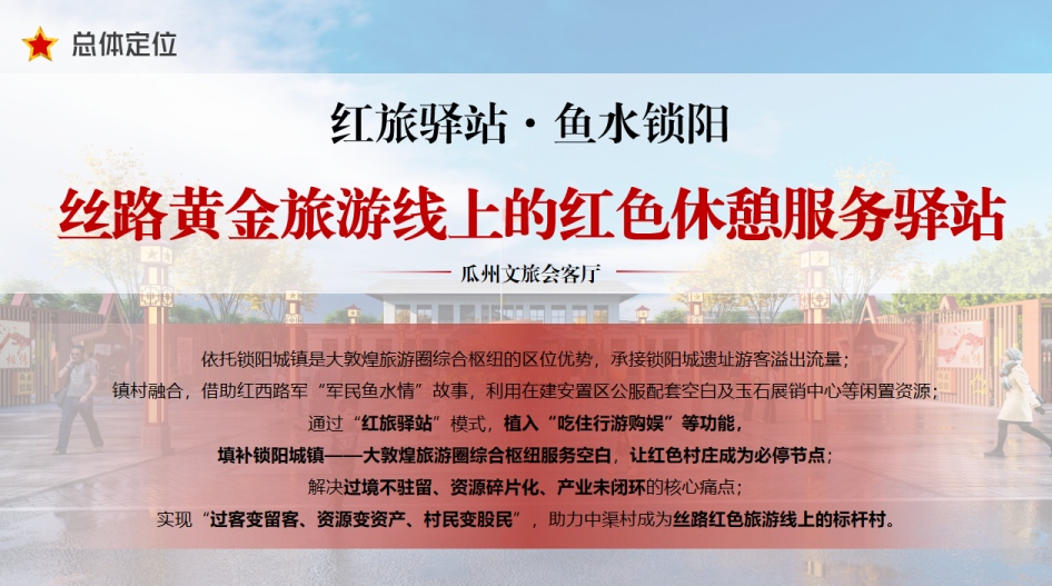 依托锁阳城镇是大敦煌旅游圈综合枢纽的区位优势,承接锁阳城遗址游客溢出流量;镇村融合,借助红西路军“军民鱼水情”故事,利用在建安置区公服配套空白及玉石展销中心等闲置资源;通过“红旅驿站”模式,植入“吃住行游购娱”等功能,填补锁阳城镇一-大敦煌旅游圈综合枢纽服务空白,让红色村庄成为必停节点;解决过境不驻留、资源碎片化、产业未闭环的核心痛点;实现“过客变留客、资源变资产、村民变股民”,助力中渠村成为丝路红色旅游线上的标杆村。