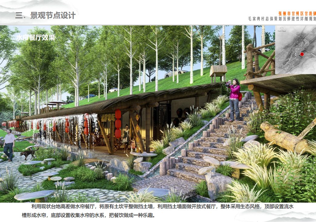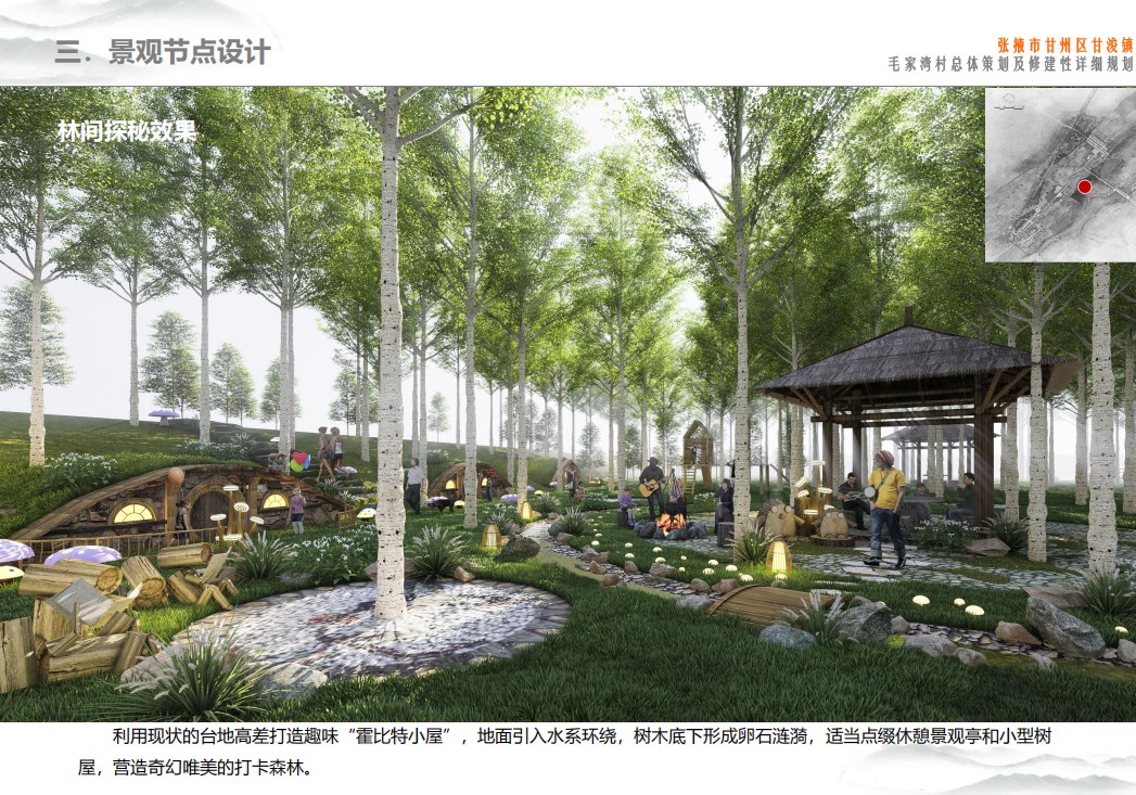 深刻把握当前市场发展形势以及未来趋势,以毛家湾村乡村自然风光为本底,以人居环境环境改造为契机,坚持“规划引领、市场主体,外部要素持续进入、本地居民高度参与”的发展理念,通过谋划整合发展空间,创新发展模式,构建农文旅融合新平台,将毛家湾村打造成集餐饮、民宿、展示、休闲、体验于一体的山水田园生态休闲度假村。